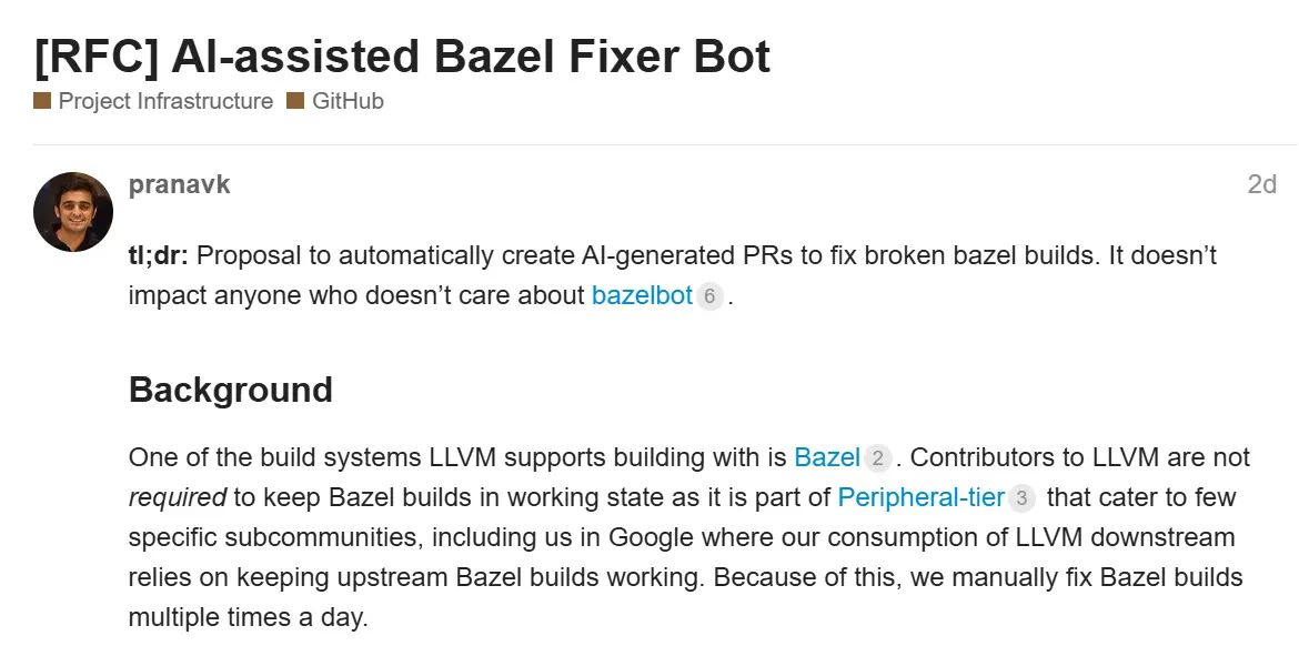 近日,谷歌編譯器工程師 Pranav Kant 又提出了一項提案,旨在創建一個 AI 輔助的 Bazel 修復機器人。這款 AI 機器人將自動生成拉取請求,用於修復使用 Bazel 構建系統時出現的 LLVM 構建問題。
