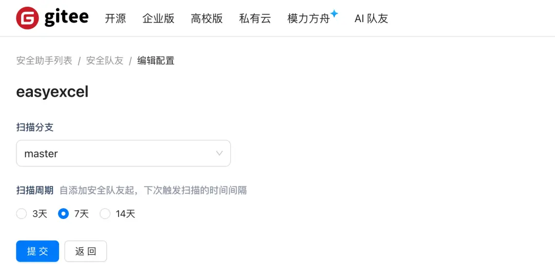 為更好地滿足用户在漏洞修復後立即觸發掃描或自定義掃描週期/分支的需求,安全隊友現已新增「配置頁」,支持以下功能: