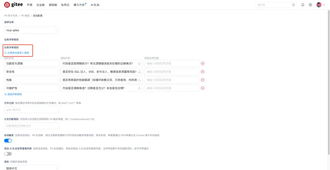 多個項目間有重複評審需求?現在,您可以直接從已有倉庫導入評審規則,複用配置邏輯,避免重複維護,特別適合擁有多個子倉庫的大型項目或企業用户。