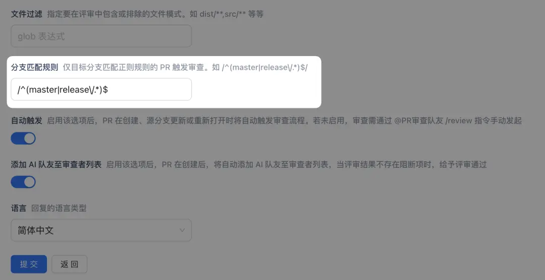 為滿足不同團隊的開發流程,PR 審查隊友現已支持配置分支匹配規則。您可設置僅針對特定目標分支(如main、release等)自動發起審查,避免不必要的審查任務。