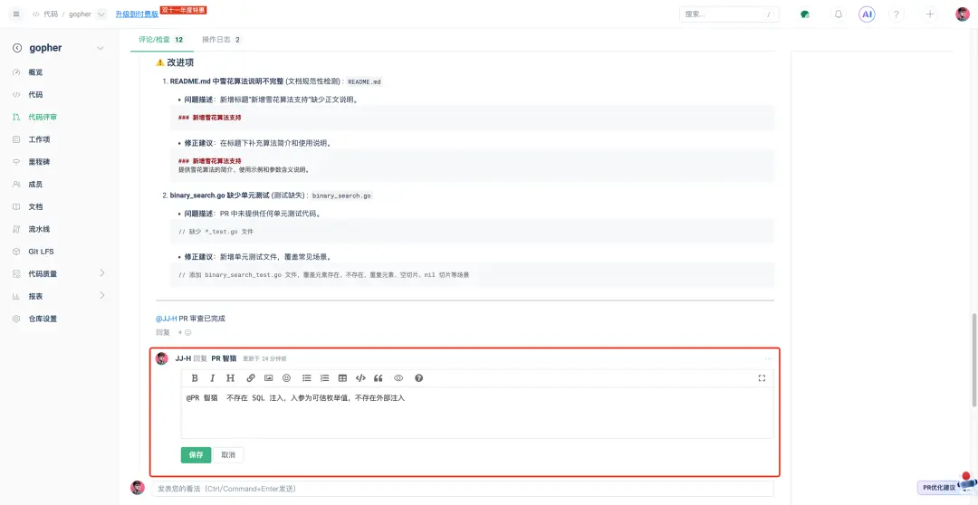 若出現 LLM 幻覺或誤報的情況,用户可通過 @AI 隊友 + 評論 進行澄清,AI 隊友將結合反饋進行更有針對性的後續審查,實現持續學習與改進。