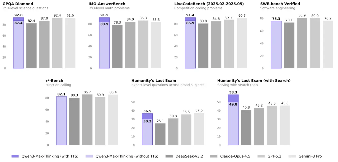 同時,Qwen3-Max-Thinking 的 API(模型名稱為 qwen3-max-2026-01-23)也已開放。