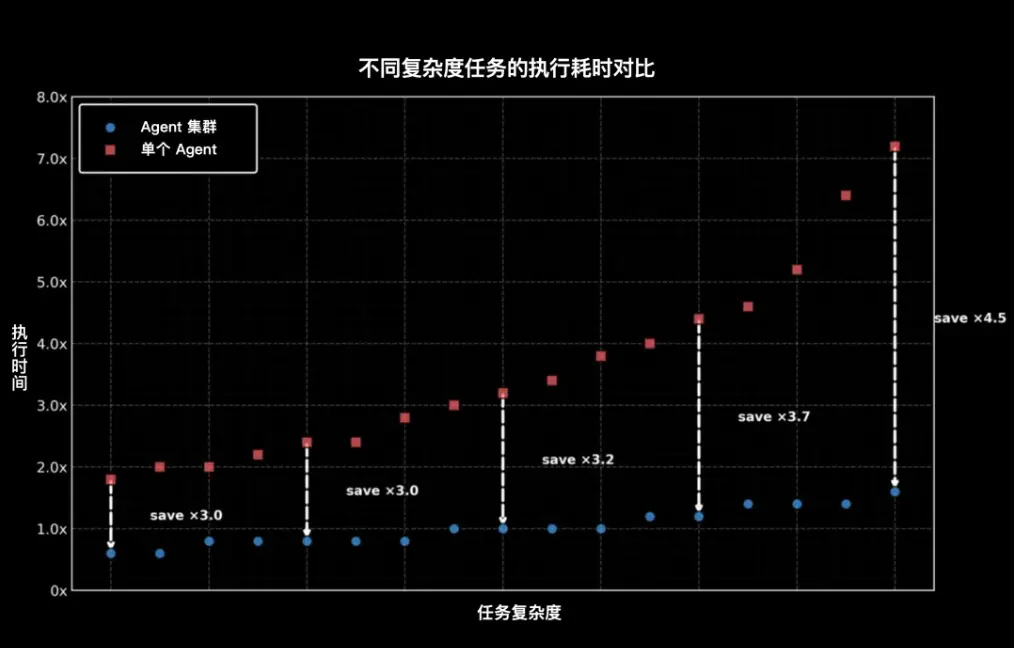 並首次引入了「Agent 集羣」能力,K2.5 能根據任務需求,現場調度多達 100 個分身,並行處理 1500 個步驟。在大規模搜索(wide search)場景下,與單 Agent 執行相比,Agent 集羣將達成目標性能所需的最少關鍵步驟減少了 3 到 4.5 倍,且隨着目標要求的提升,節省幅度進一步擴大;通過並行化,實際運行時間(wall clock)最高可縮短 4.5 倍。