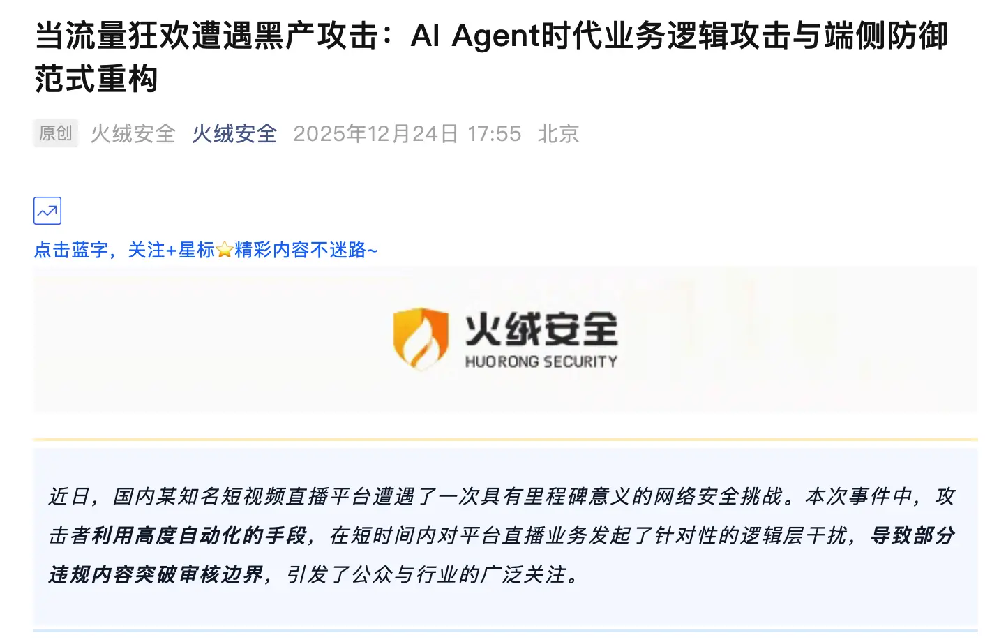 火絨安全官方發文,覆盤快手平台直播遭黑灰產攻擊事件。