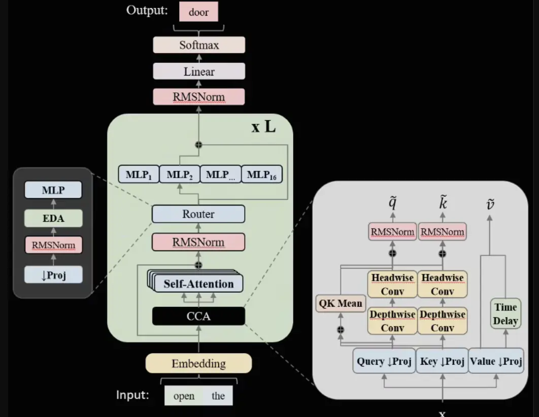 - CCA注意力:卷積+壓縮嵌入注意力頭,顯存佔用↓32%,長上下文吞吐↑18%