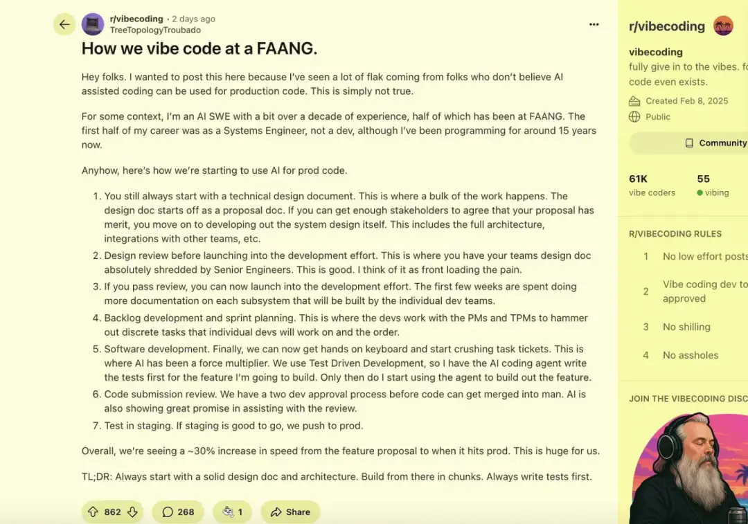 氛圍編程(vibe coding)並不等同於 AI 輔助的工程實踐。近期一則 Reddit 帖子[1]描述了某 FAANG 團隊如何使用 AI,由此引發了一場重要討論:"氛圍編程"與專業化的"AI 輔助的工程實踐"。