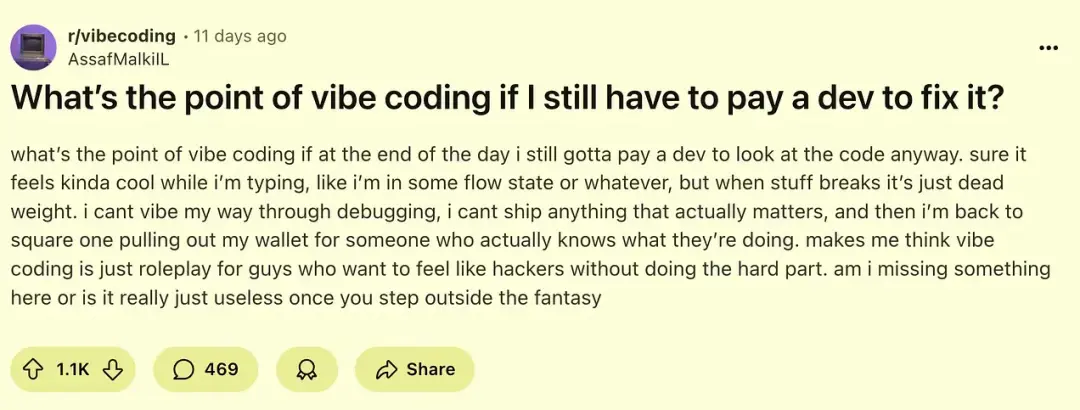 批評聲中,開發者們講述氛圍編程如何負面影響其工作流程與團隊協作。某 Reddit 熱帖[9]的最高贊評論慨嘆: