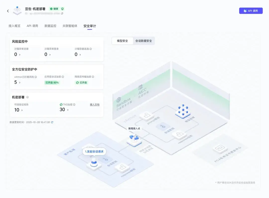 近日,火山方舟作為一站式大模型服務平台,將 AICC 機密計算技術原生內置於平台,在行業內率先推出 MaaS 原生的機密推理服務。用户在火山方舟選擇"機密部署"方式,即可一鍵開啓豆包大模型的機密推理服務。