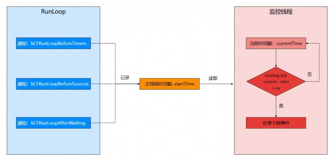 kCFRunloopBeforeWaiting和kCFRunLoopExit通知時,把running狀態置為 NO。 - 監控線程需要持續讀取