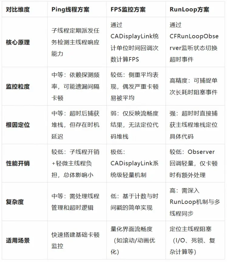 - Ping 線程方案通過子線程週期性探測主線程響應時間識別卡頓,但精度低於 RunLoop 方案。