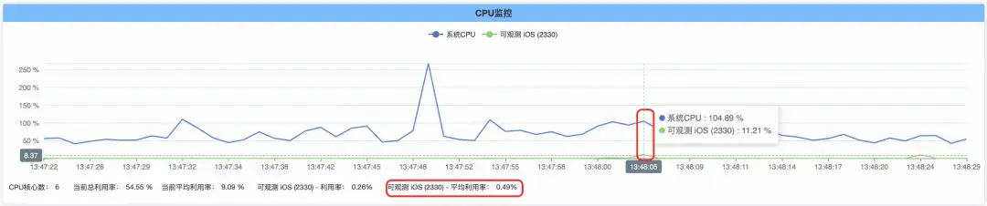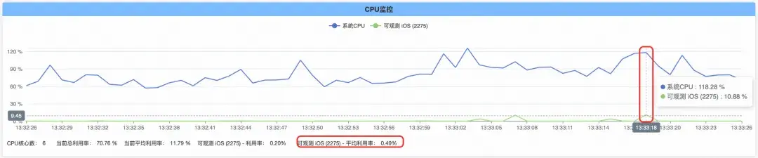 卡頓監控功能開啓的情況下,App 持續運行一段時間並主動觸發卡頓,App 整體的 CPU 佔用如下圖: