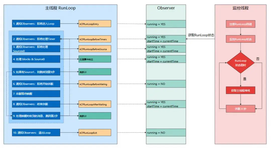 - RunLoop 方案則介入主線程事件循環機制,實現單次阻塞事件的毫秒級捕捉,可精準識別主線程阻塞源。