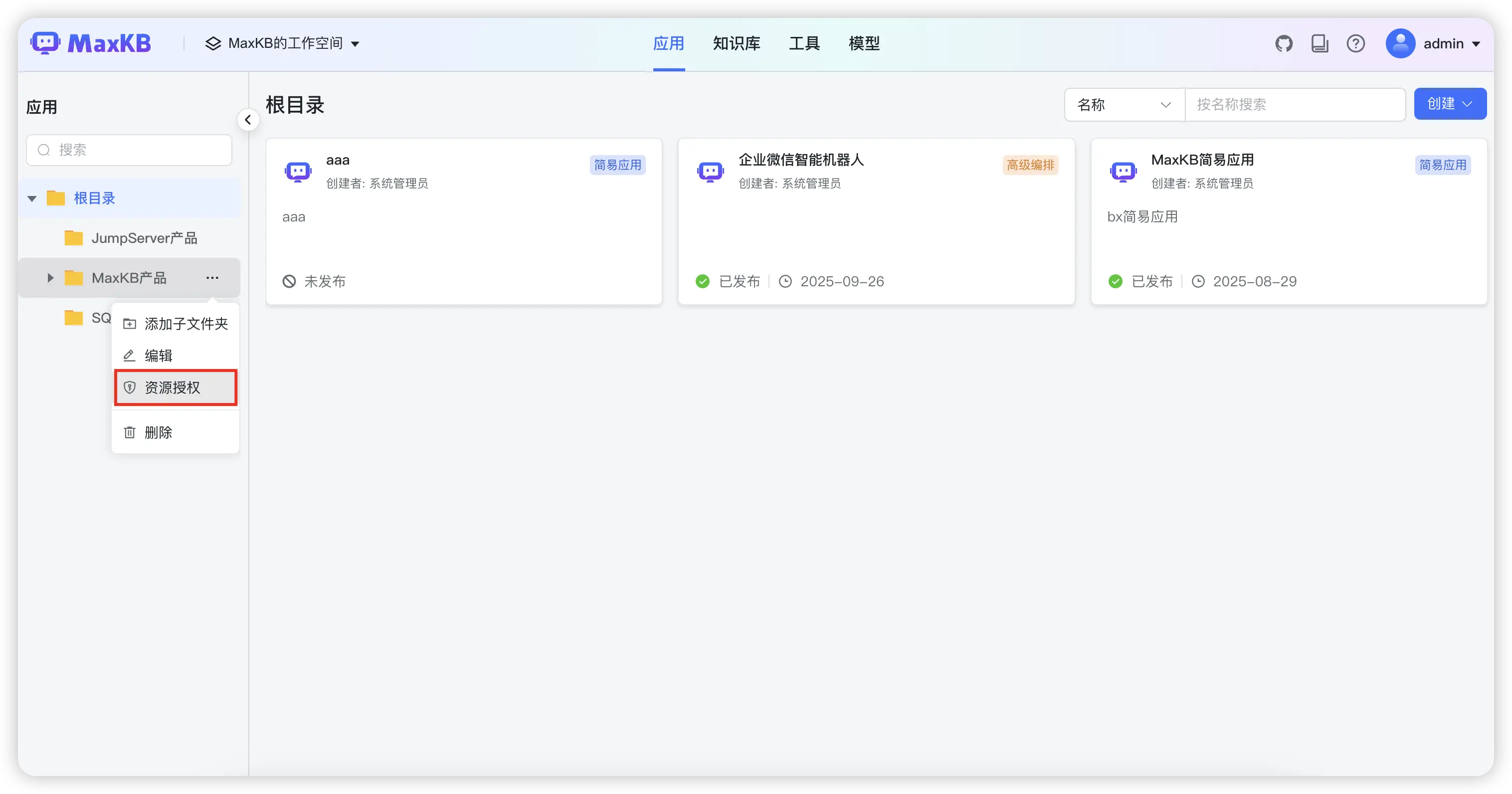 ▲圖9 MaxKB在工作空間中支持按文件夾進行資源授權