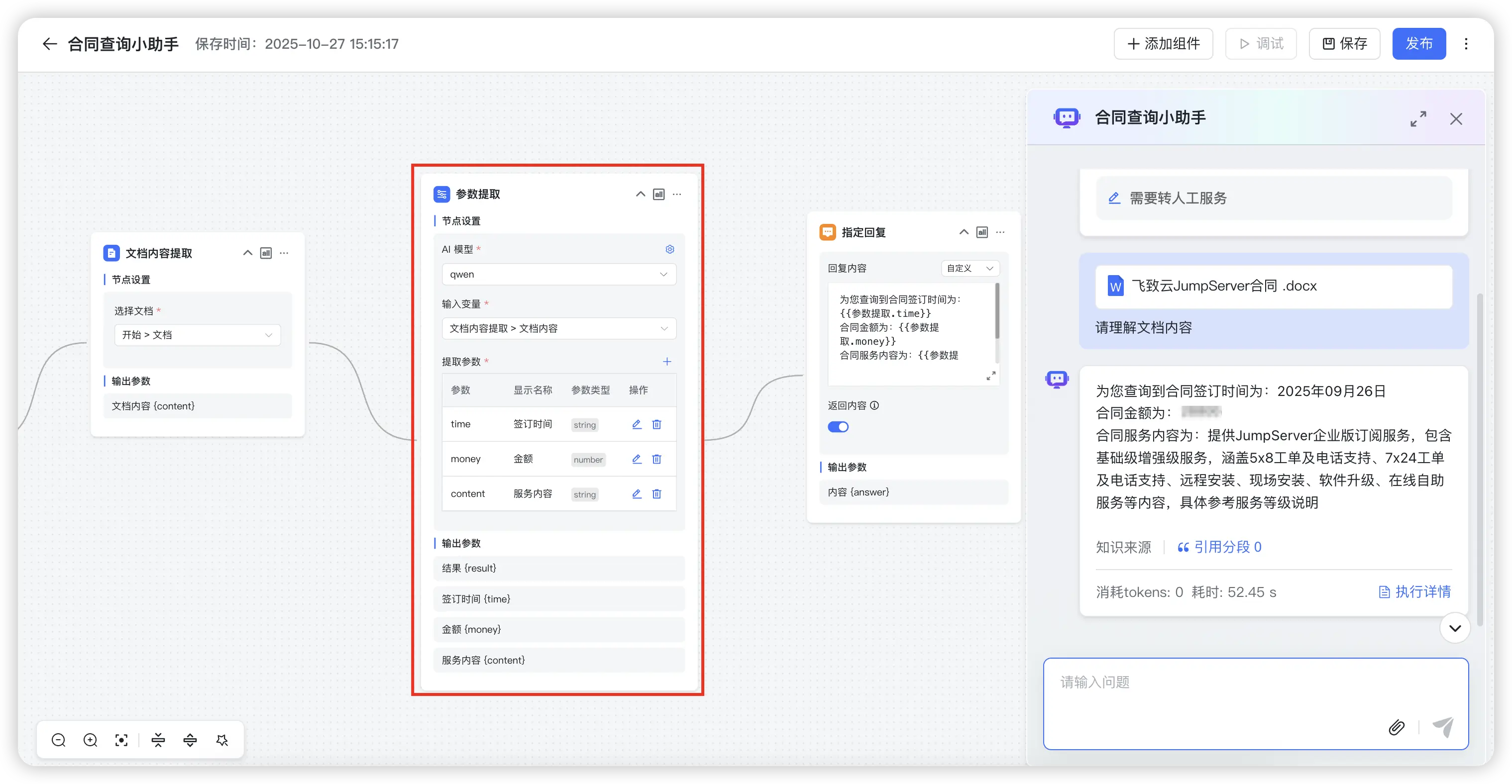 參數提取:該節點支持基於AI模型從非結構化文本或半結構化文本中提取結構化參數。典型的使用場景包括在處理合同文檔時,自動提取“簽訂日期”、“合同金額”、“服務內容”等關鍵參數。