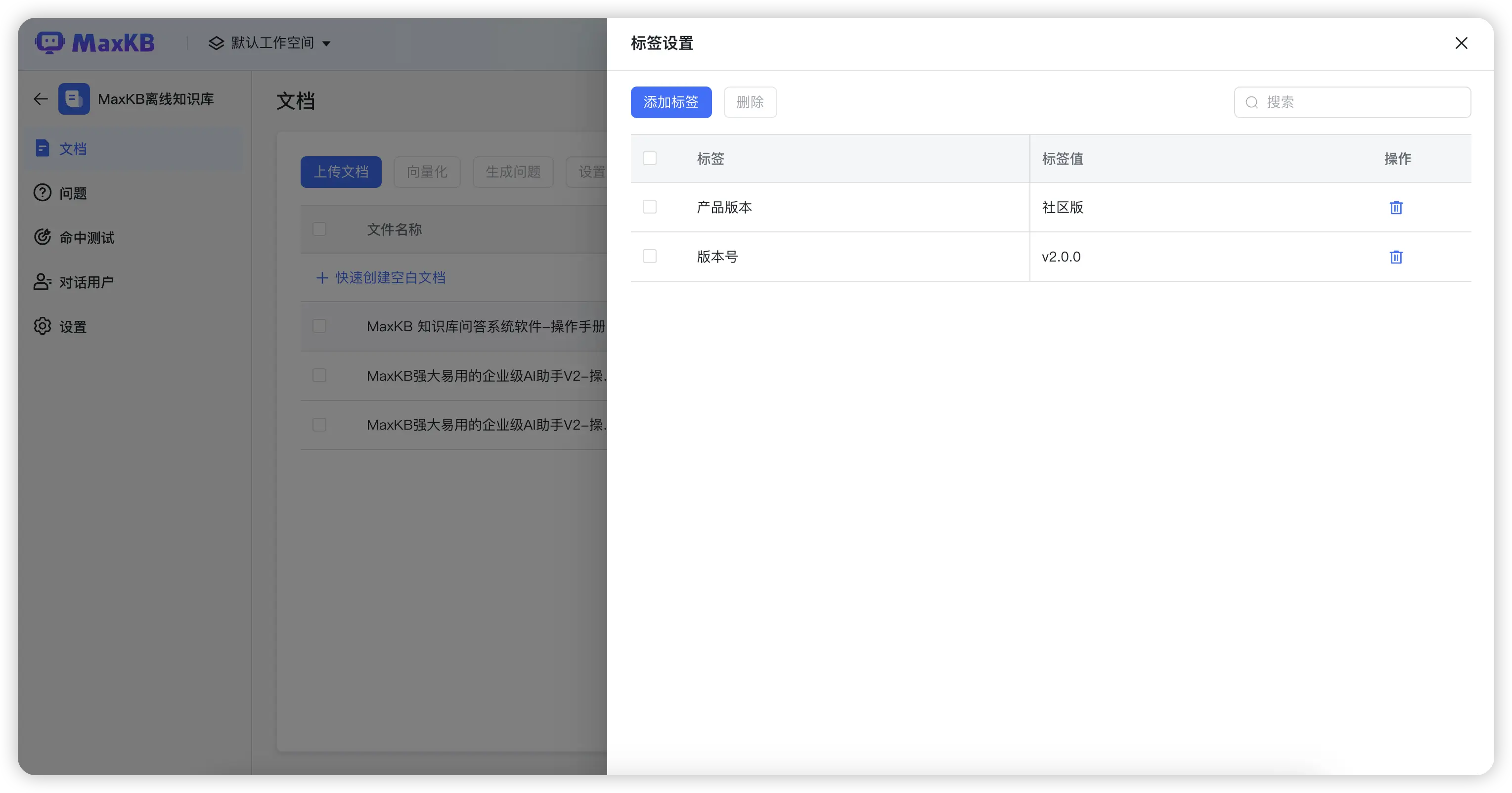 標籤管理:MaxKB在知識庫的“文檔”頁面新增標籤管理功能,每個知識庫都擁有獨立的標籤管理體系。用户可以在知識庫中選擇“文檔”→“標籤管理”,進行標籤元數據的配置。