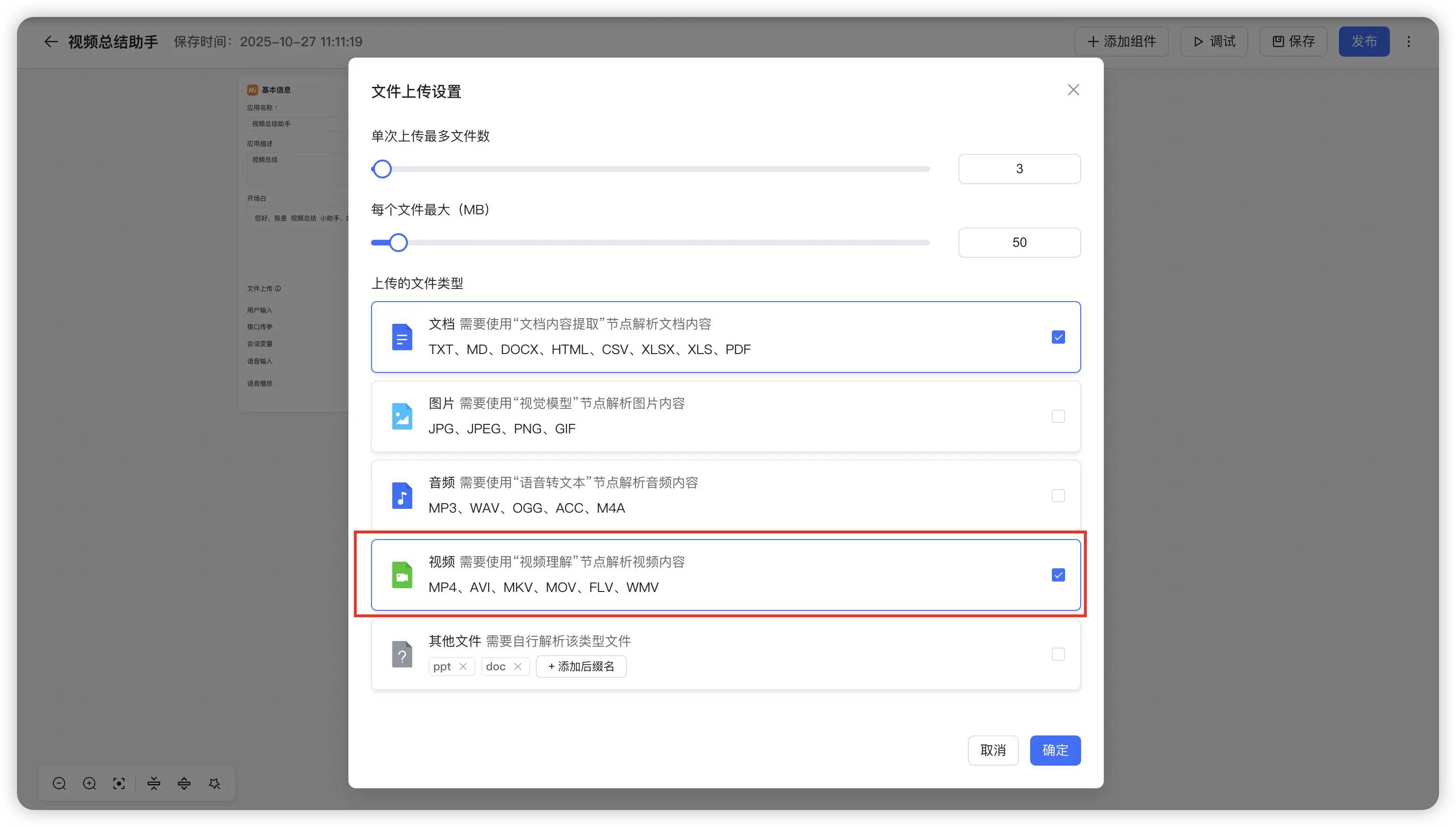視頻理解:MaxKB在文件上傳設置中新增“視頻”類型選項,勾選後用户可在問答頁面上傳視頻文件(例如MP4、AVI等格式),為後續解析提供輸入源。配合工作流中新增的“視頻理解”節點,可以實現對用户上傳視頻的深度解析及文本轉化輸出。