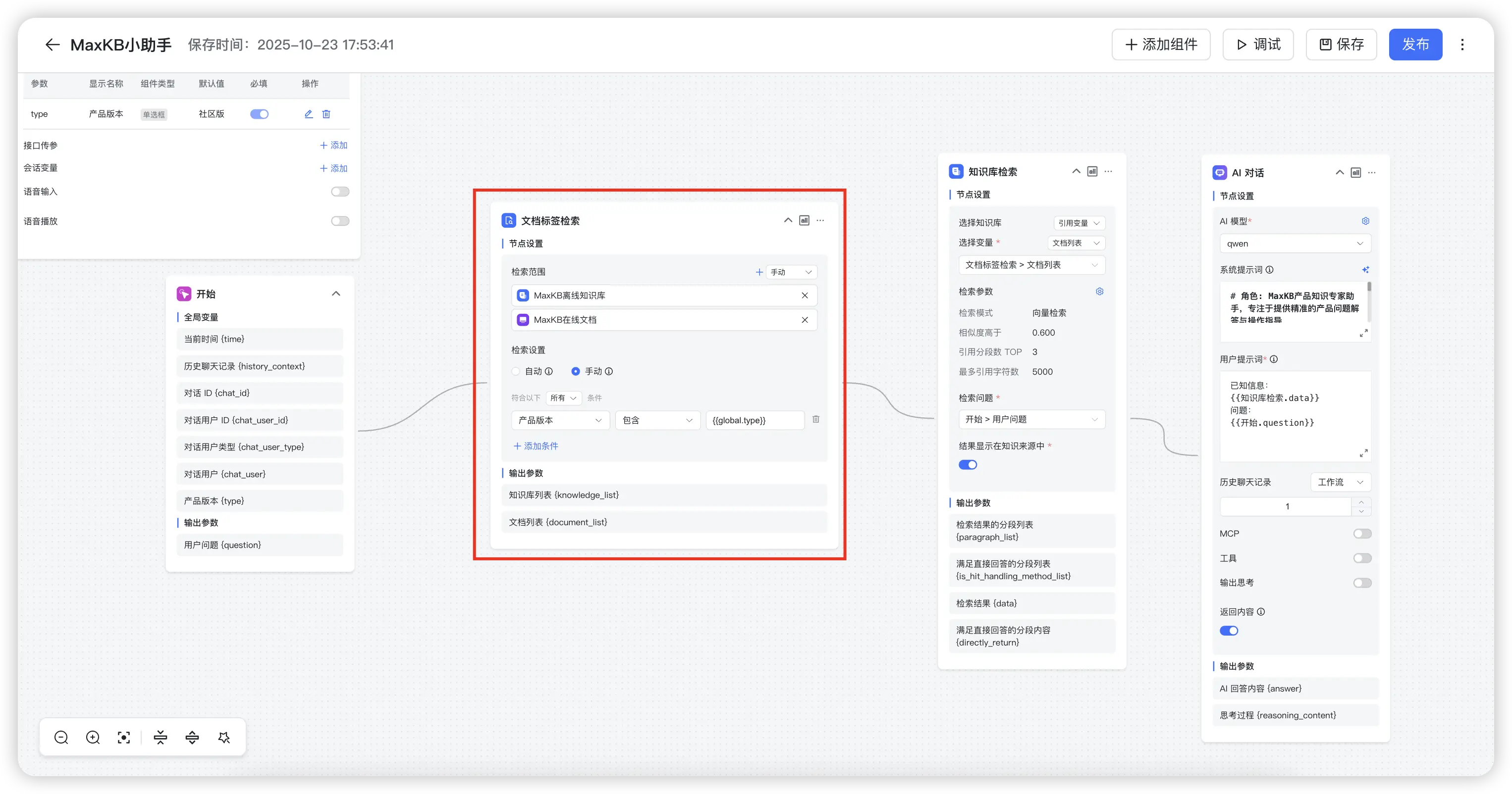 文檔標籤檢索:MaxKB在高級編排應用中新增文檔標籤檢索節點。該節點的主要功能是通過設置好的文檔標籤篩選條件檢索出符合條件的文檔,再配合知識庫檢索節點進行分段內容檢索,從而進一步縮小檢索範圍,讓檢索結果更加準確。