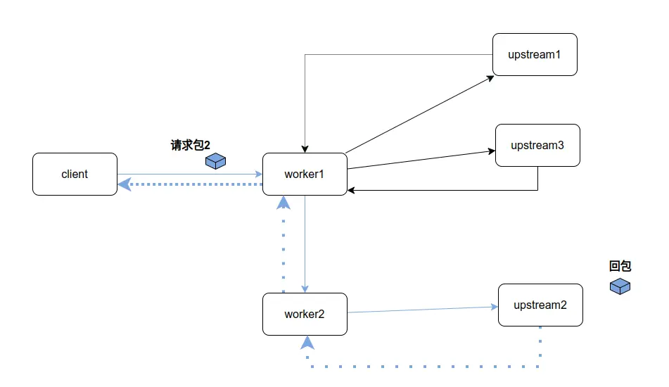 上圖所顯示的worker1 接收到消息,轉發到worker2,以及回包worker2轉發到worker1,就採用了NJet內置的event框架,但10ms級別的處理性能,遠不能滿足消息服務器的處理性能指標要求,甚至由於加入了跨進程通信,出現了多worker處理能力遠小於單worker處理能力的荒謬情況