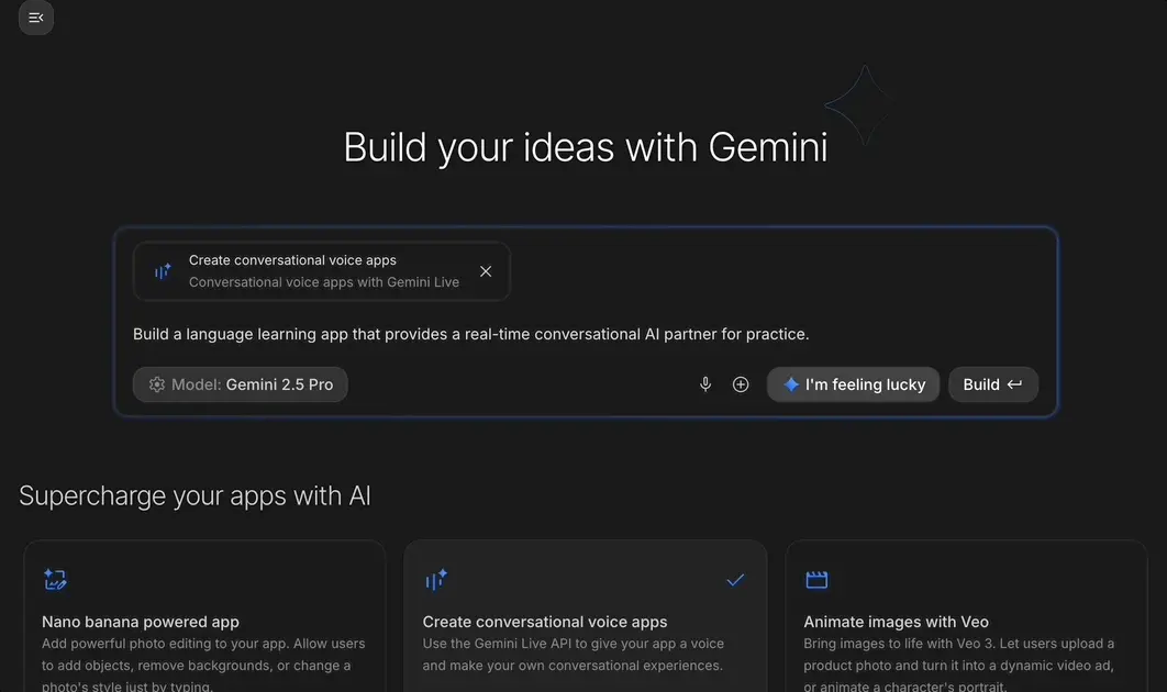 AI Studio於去年推出,與面向數據科學家等專業人士的Vertex AI不同,其核心目標是降低AI應用開發門檻。此次更新後,平台“構建”板塊新增應用畫廊與模型選擇器;為生產級應用提供“秘密變量”功能以安全存儲API密鑰。