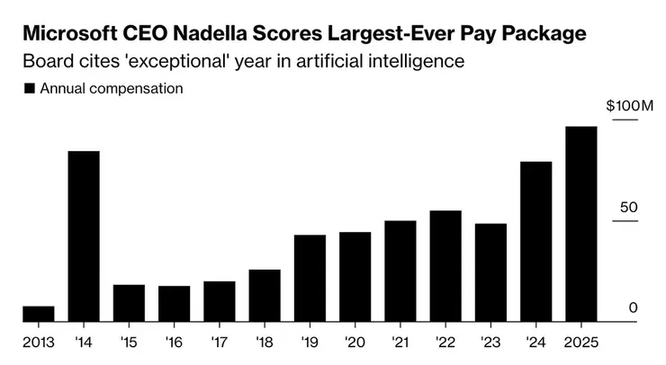 納德拉的薪酬較2024財年的7910萬美元增長22%。微軟在監管文件中表示,納德拉的薪酬中包含250萬美元的基本工資,90%的薪酬以微軟股票形式發放。納德拉自2014年起擔任微軟的第三任CEO。