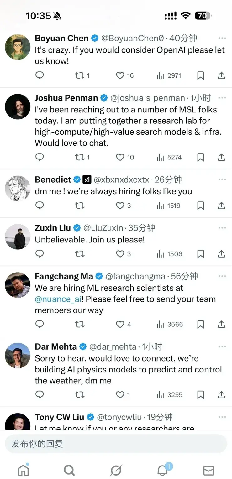 在田淵棟宣佈離職的帖子下,OpenAI、XAI、Anthropic等頭部AI公司紛紛拋出橄欖枝。這種公開“搶人”現象,在傳統的科技行業裁員中並不常見,凸顯了頂尖AI研究人員的稀缺性和價值。