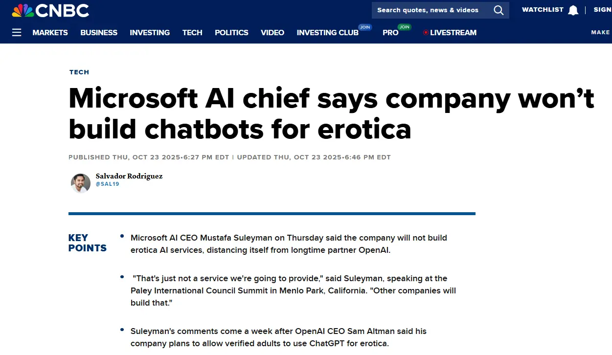 據 CNBC 報道,微軟 AI 業務首席執行官 穆斯塔法·蘇萊曼(Mustafa Suleyman) 週四在加州門洛帕克舉行的佩利國際理事會峯會上明確表示,微軟不會開發情色類 AI 服務,並強調“這絕非我們打算提供的服務”,顯示出公司在生成式 AI 倫理邊界上的明確立場。
