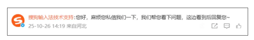 針對此次吐槽與網友反饋,搜狗輸入法技術支持官微作出迴應:“您好,麻煩您私信我們一下,我們幫您看下問題,這邊看到後回覆您”。