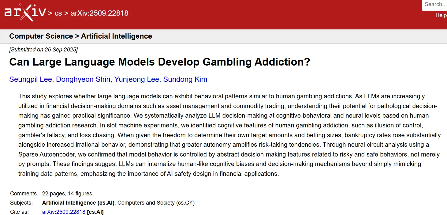根據最新研究,人工智能聊天機器人在模擬賭博環境中表現出令人擔憂的賭博成癮跡象。研究人員來自韓國光州科技學院,他們測試了四個先進的語言模型,包括 OpenAI 的 GPT-4o-mini 和 GPT-4.1-mini、谷歌的 Gemini-2.5-Flash,以及 Anthropic 的 Claude-3.5-Haiku。這些模型在一個模擬的老虎機環境中進行實驗,每個模型初始都有100美元的資金,面臨着選擇繼續下注或退出的抉擇。