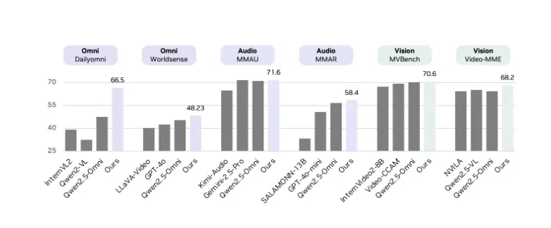 OmniVinci 的目標是創建一個能夠同時理解視覺、音頻和文本的全能 AI 系統,使機器能夠像人類一樣通過多種感官感知並理解複雜的世界。為了實現這一目標,英偉達團隊採取了創新的架構設計和數據管理策略,通過一個統一的全模態潛在空間,將不同感官的信息融合在一起,實現了跨模態的理解和推理。