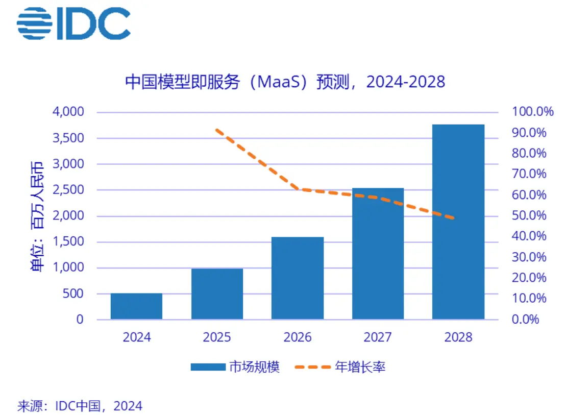 國際數據公司 (IDC)最新發佈的《中國模型即服務(MaaS)及AI大模型解決方案市場追蹤,2024H1》報告顯示,中國MaaS市場的規模在2024上半年已達到2.5億元人民幣,2024-2028年,這一市場預計將繼續快速增長,年均複合增長率為64.8%,到2028年市場總規模將達到38億元人民幣。
