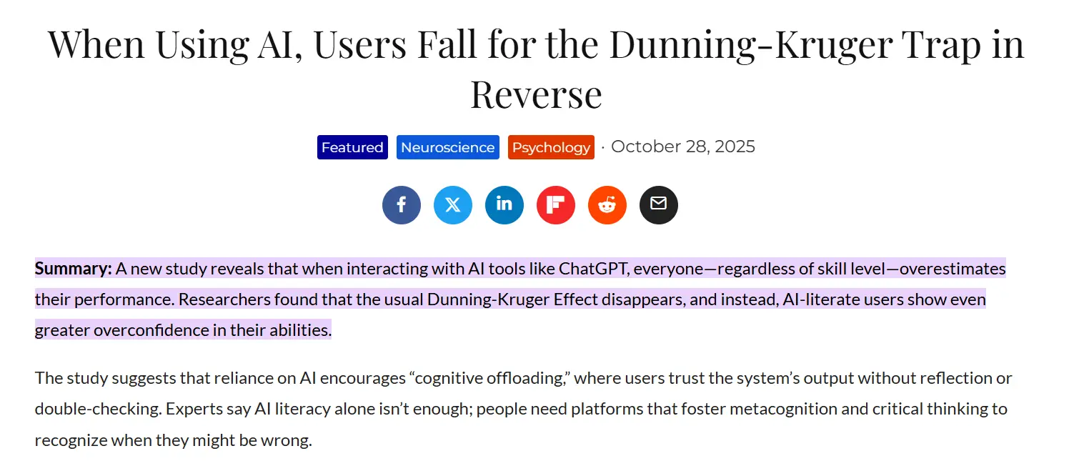 根據阿爾託大學的研究,使用人工智能(AI)工具可能使我們對自己的認知能力產生誤判。普遍情況下,人們傾向於自我評估為 “略好於平均水平”,這種現象在認知測試表現較差的人羣中尤為明顯,被稱為 “達克效應”(Dunning-Kruger Effect)。也就是説,能力較差的人往往高估自己的能力,而能力較強的人卻更容易低估自己。