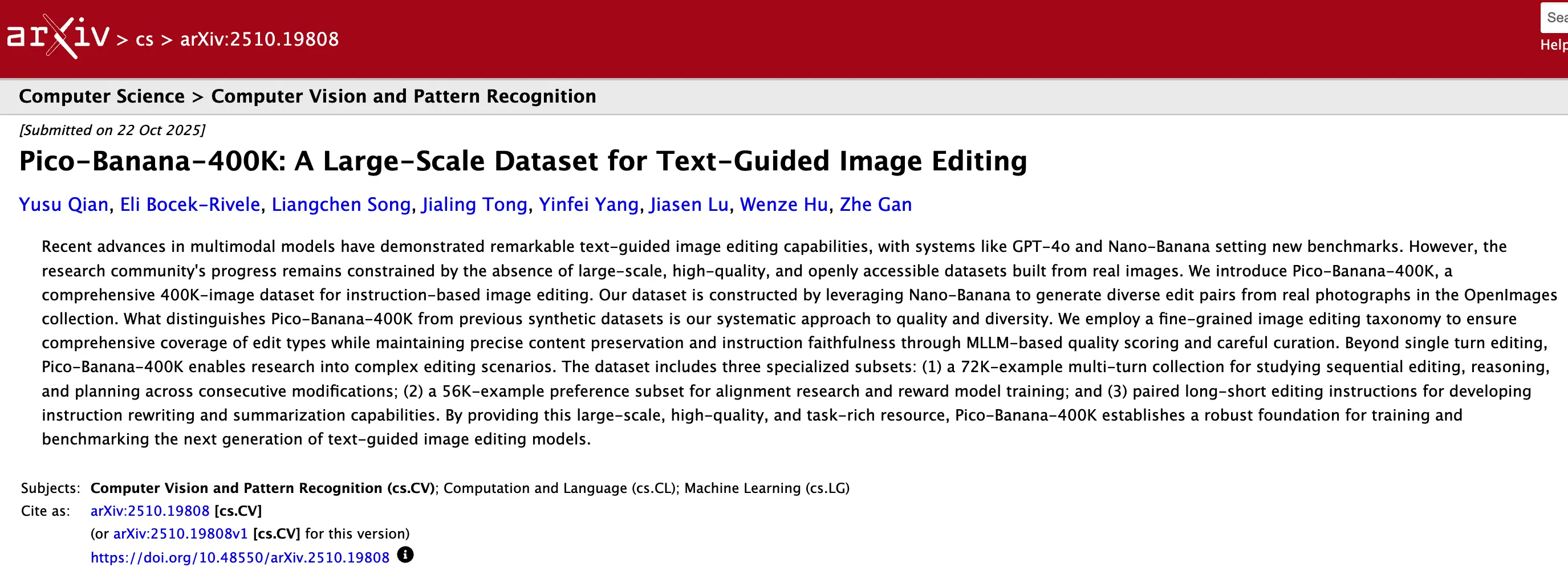 蘋果公司近日發佈Pico-Banana-400K數據集,含40萬張精選圖像,該數據集依託Google Gemini-2.5系列模型構建,相關研究論文《Pico-Banana-400K:面向文本引導圖像編輯的大規模數據集》同步公開。