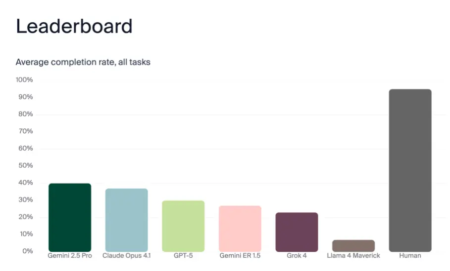 然而結果表明,這些先進的機器人在執行任務時的成功率遠遠低於人類,具體數據顯示,Gemini2.5Pro 的成功率僅為40%,Claude Opus4.1為37%,而 GPT-5更是低至30%。這些數字表明,儘管它們具備強大的文本生成能力,但在實際的空間推理、環境理解和長期任務規劃等領域仍顯得力不從心。