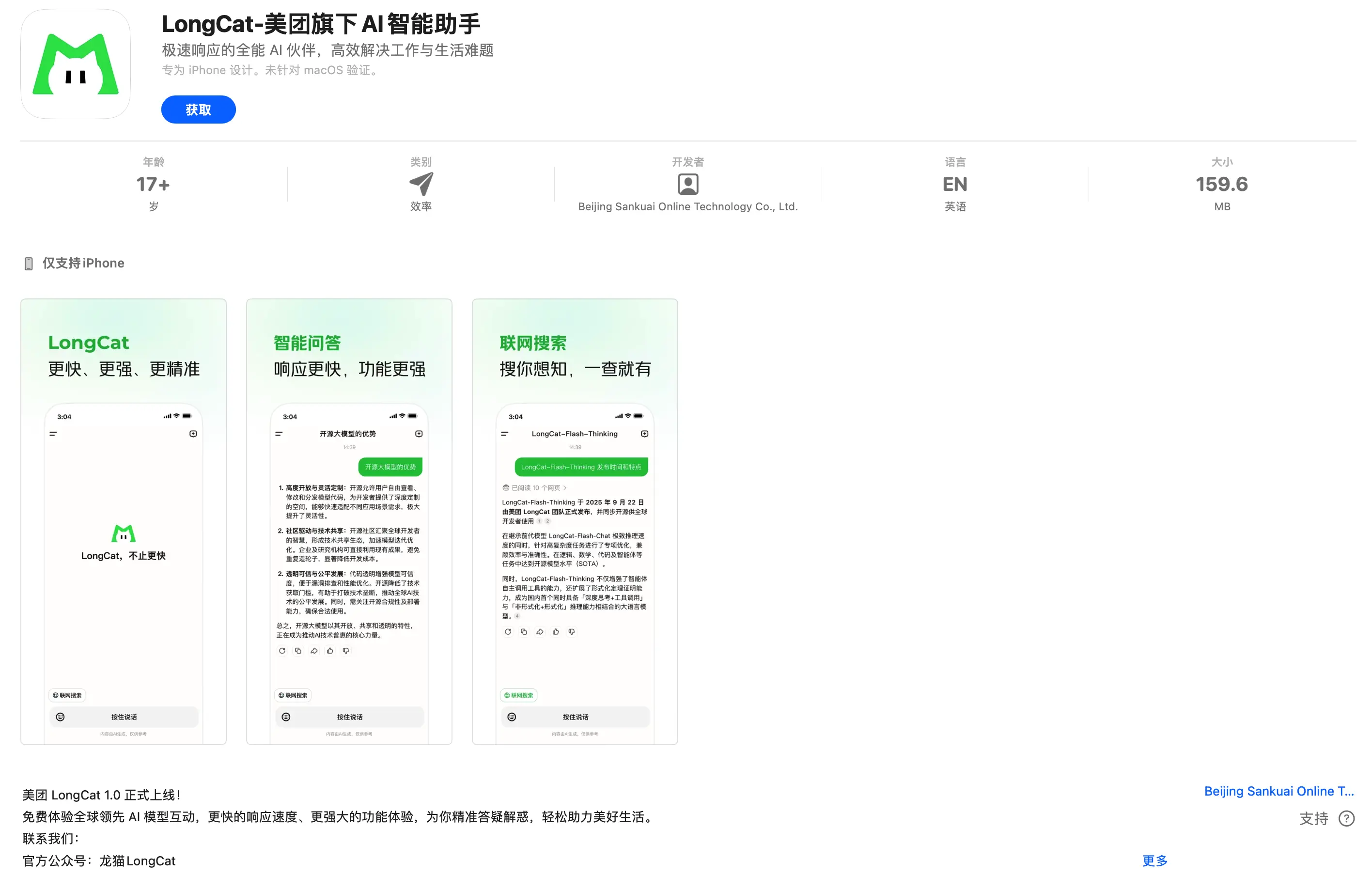 iOS 用户可直接在 APP Store 中搜索“LongCat”獲取。