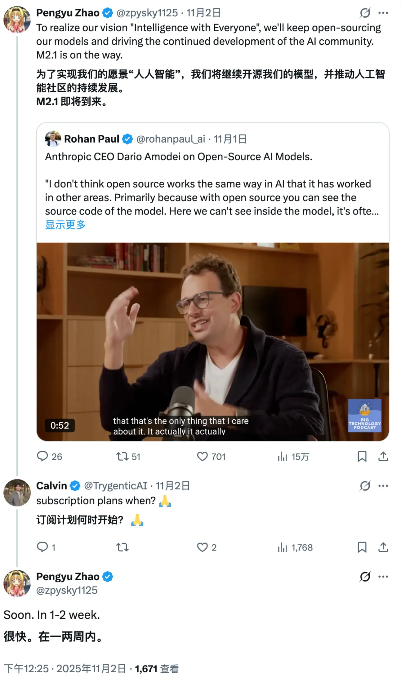MiniMax LLM 負責人 Pengyu Zhao 表示,為了實現“Intelligence with Everyone”的願景,公司將繼續開源其模型,以推動人工智能社區的持續發展。作為該計劃的一部分,他確認新模型 M2.1 即將推出。