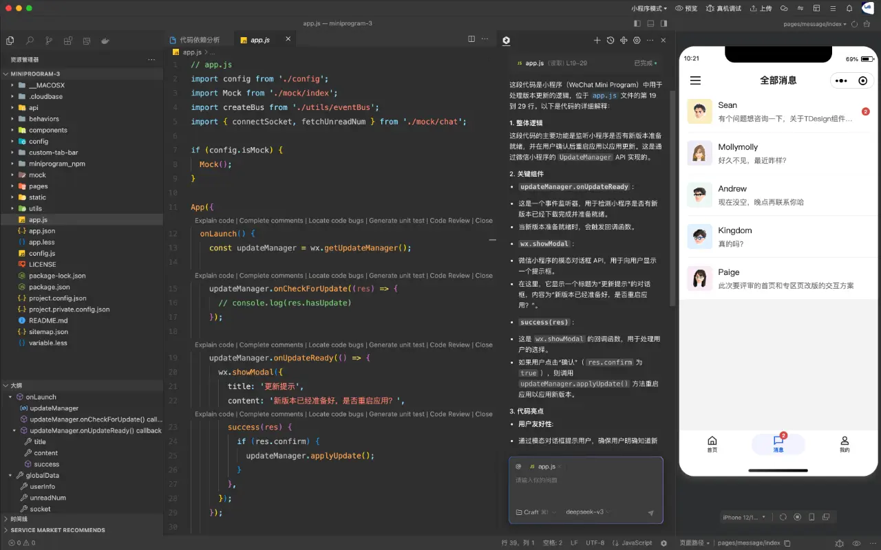 新版開發者工具深度融入「編程助手 CodeBuddy」插件,無論是實現一個簡單的排序算法,還是開發一個完整的小程序頁面,甚至是構建一個完整的小程序項目,都變得觸手可及。