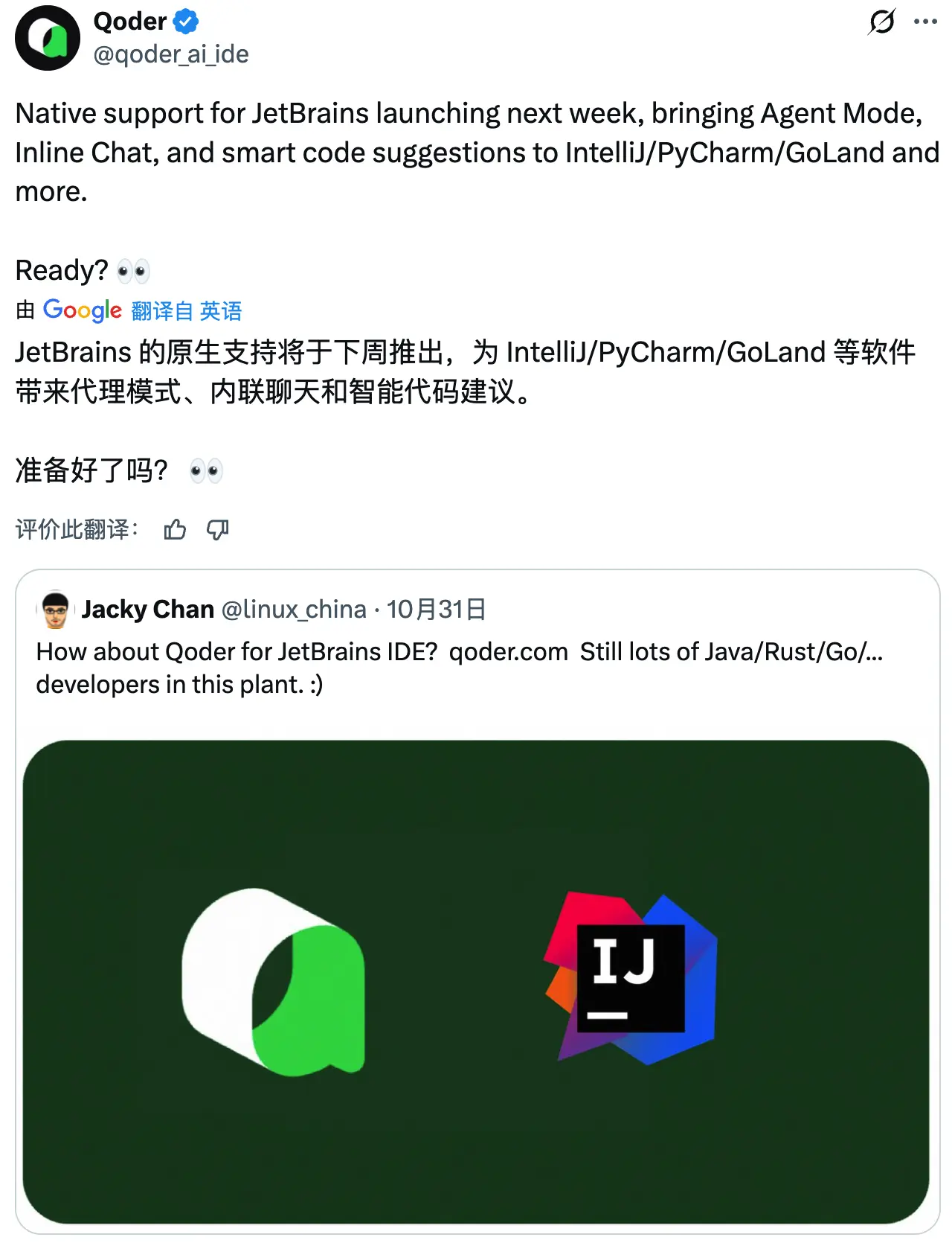 阿里 AI 編程工具 Qoder 在社交媒體發佈動態,預告將於本週正式為 JetBrains 系列 IDE(包括 IntelliJ、PyCharm、GoLand 等)推出原生支持。