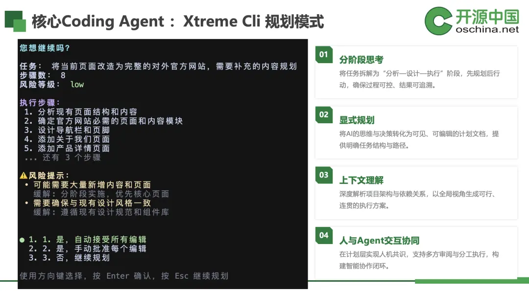 相比傳統 AI 輔助編程,Gitee 自研的 Xtreme Cli 核心智能體已邁向更高階段:它不僅能寫代碼,更能「寫項目」。
