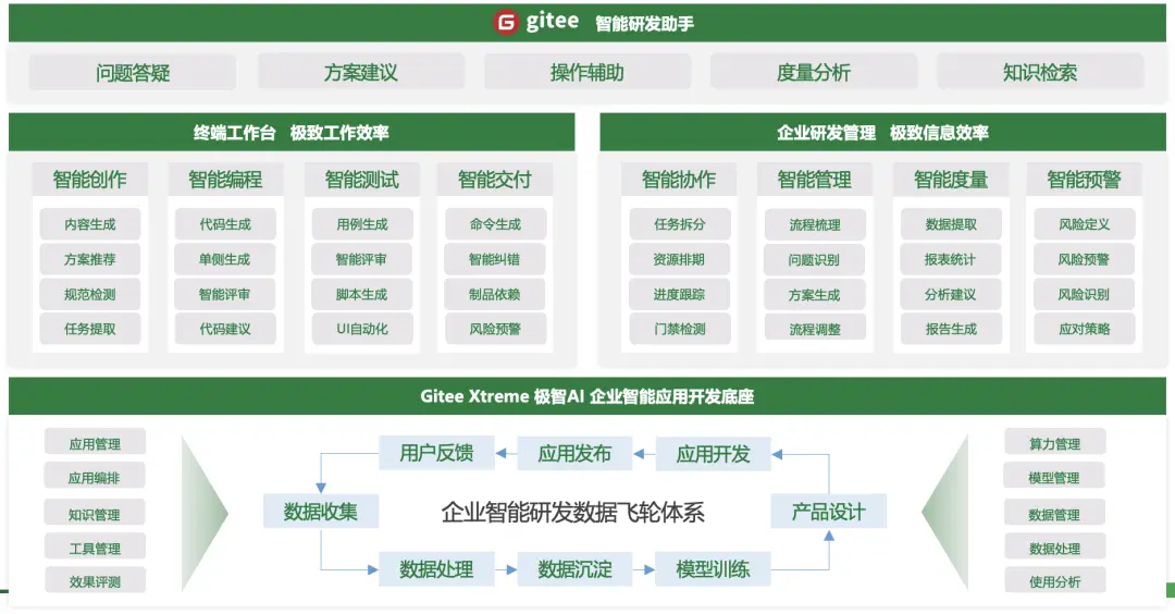 圍繞這一目標,Gitee 提出了融合 DevOps 與智能體(Agent)的全新架構,以 Gitee DevOps 為地基,以智能體驅動為核心,構建出一整套覆蓋研發全流程的智能化體系,既解放人力、又保障質量,讓企業研發真正步入 AI 原生時代。