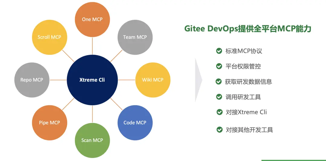 為了讓智能體在企業研發流程中真正落地,Gitee 構建了覆蓋工具、權限、數據的全平台 MCP: