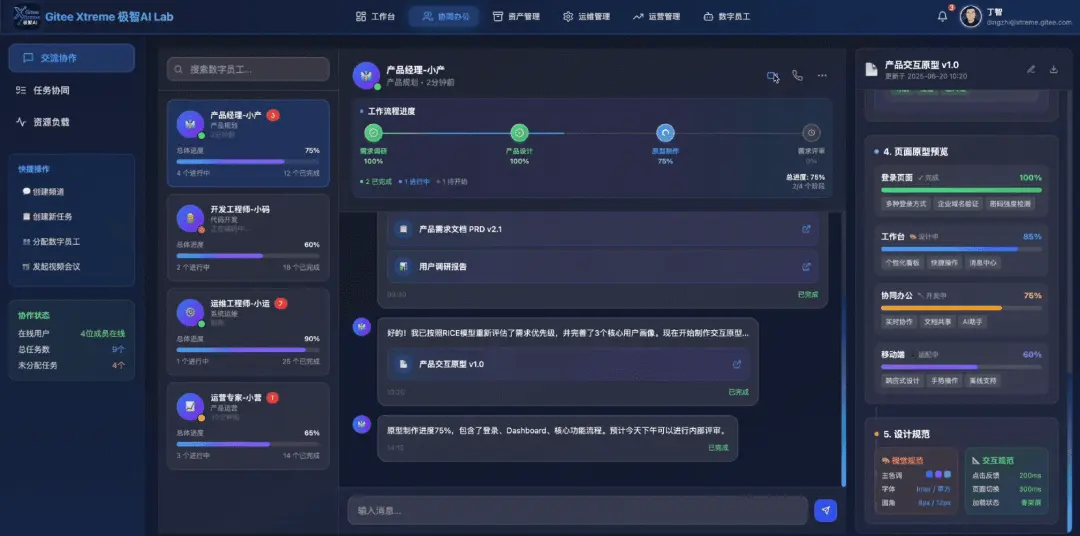 Gitee 的智能研發體系不僅提升了單點工具的智能化水平,更致力於打造多智能體協作體系:不同能力的智能體(代碼生成、測試編排、文檔解析、數據分析等)可並行運行,協同處理複雜研發任務。