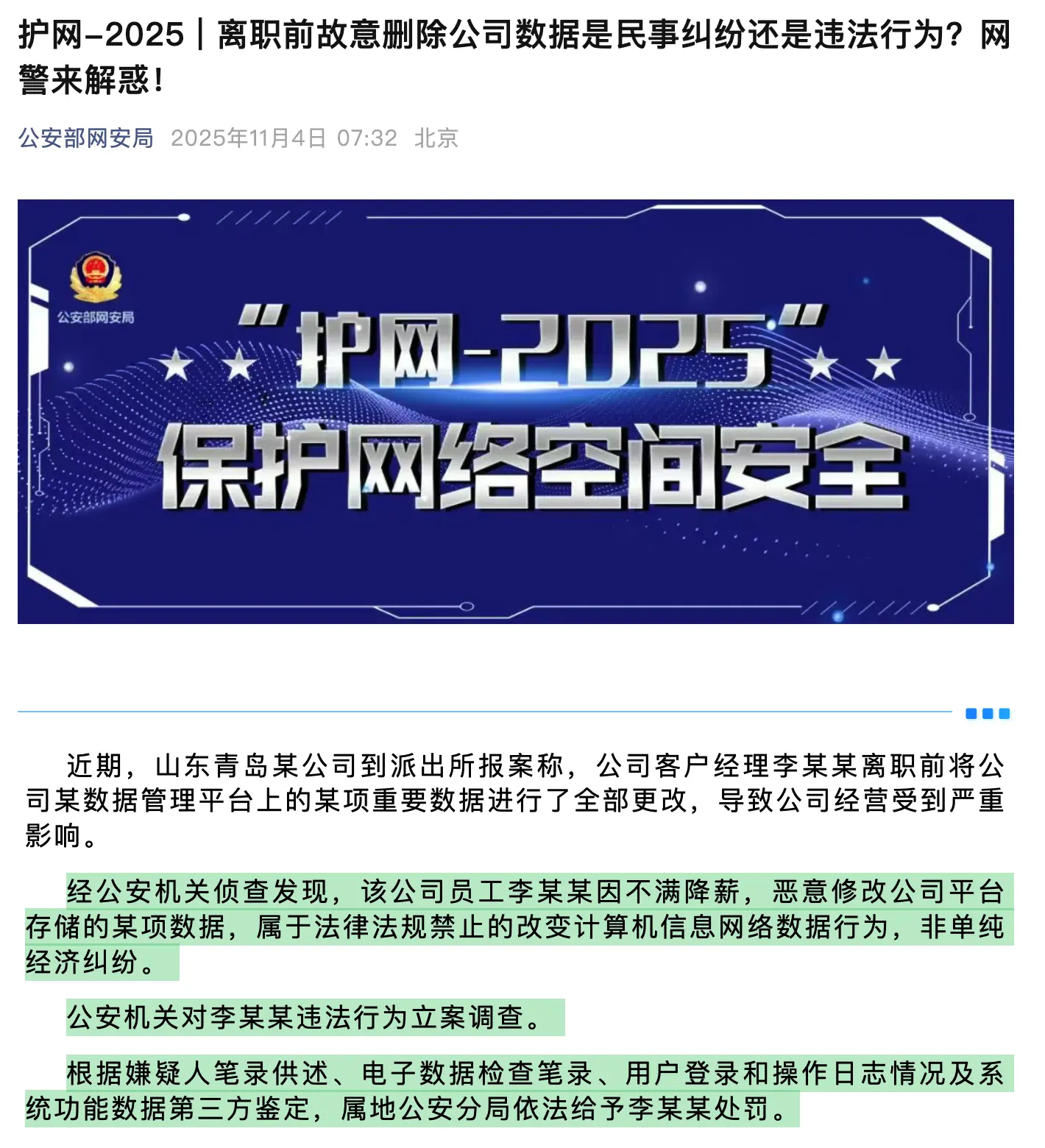 網警表示,因離職或工資糾紛通過刪除公司數據惡意報復的違法行為並不少見,當事人缺乏法律意識,認為行為僅是民事糾紛,實際已構成違法犯罪!