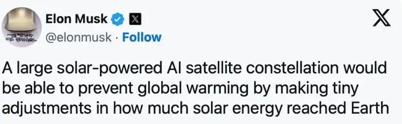 埃隆·馬斯克本週在X上拋出新的氣候“降温方案”:部署一組由人工智能控制的衞星,通過微小調整地球接收的太陽輻射量,以抑制全球變暖。這一構想類似學術界討論多年的太空“遮陽傘”方案,但此前主要停留在理論階段。