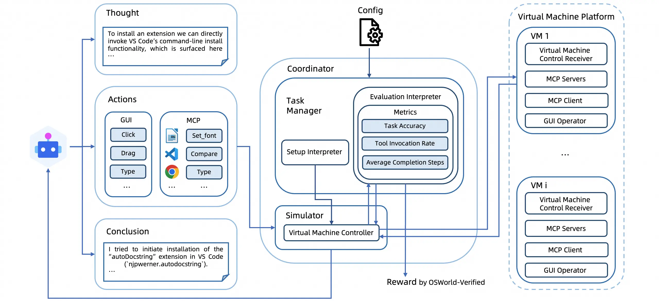 下圖是 OSWorld-MCP 評估框架,集成了 GUI 操作和 MCP 工具調用: