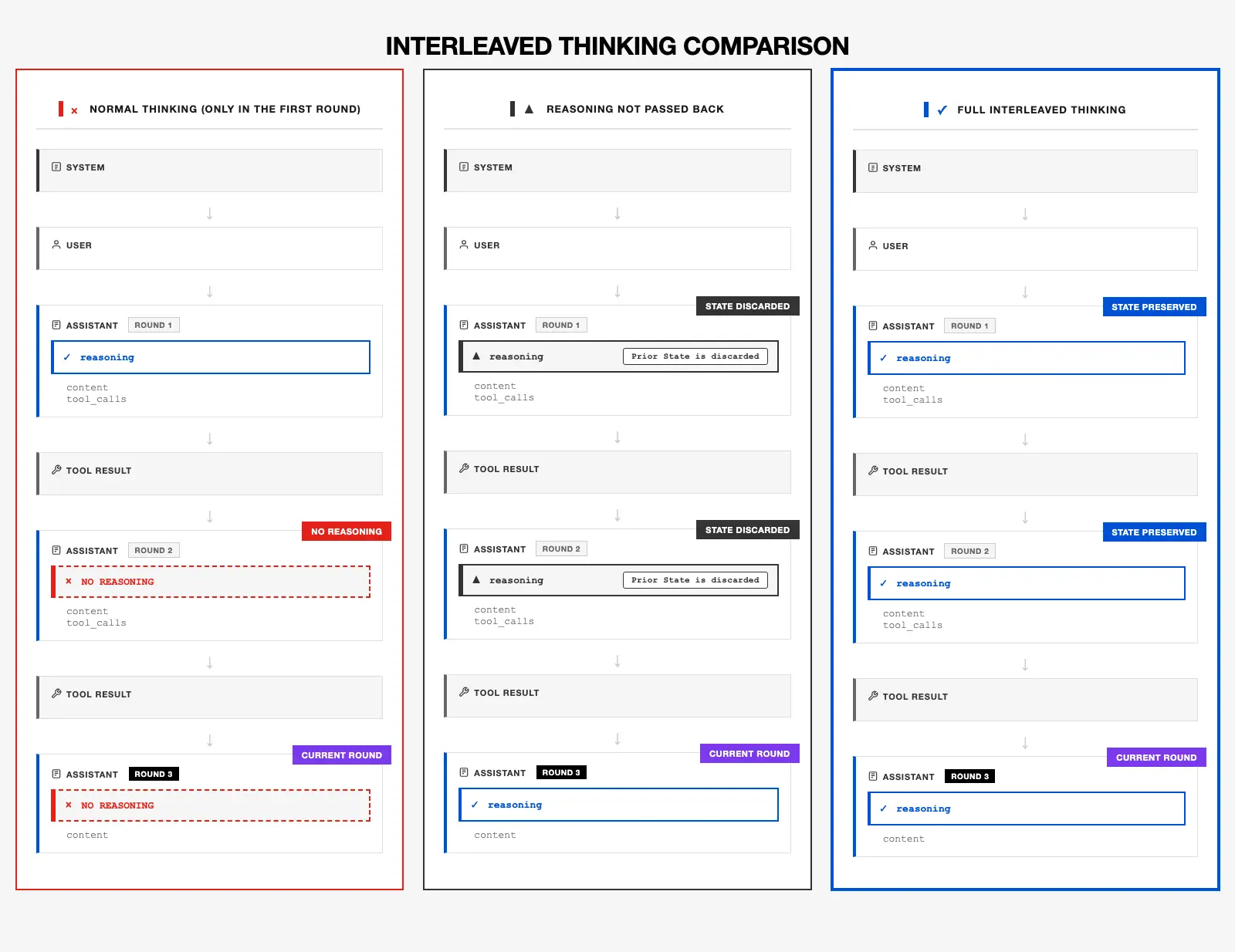 保持 Interleaved Thinking 狀態完整至關重要 —— 模型的可靠性不僅在於它當前的想法,更在於它能否回顧和修正之前的想法。Interleaved Thinking 把這一過程機制化:計劃 → 行動 → 反思,且狀態始終保留,讓反思得以累積,讓修正在多輪交互中傳遞。
