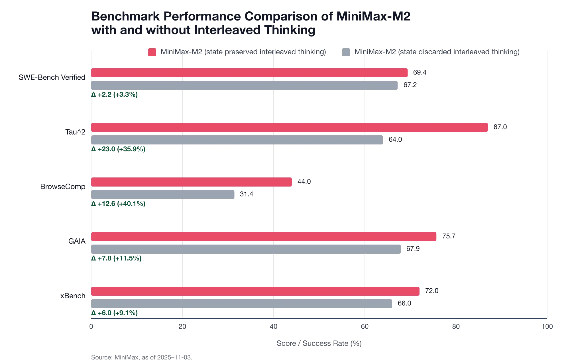 在 MiniMax M2 中,只有保留並把上一輪的推理反饋到後續輪次,Interleaved CoT 才能發揮最大效果。模型會在工具調用之間進行推理,將計劃、假設、約束與中間結論持續向後傳遞—— 正是這種可持續、可累積的推理狀態讓 M2 模型穩定可靠。一旦丟棄了之前的推理狀態,模型的累積理解能力會下降,狀態偏離會增加,自我修正能力會減弱,規劃能力也會退化,尤其在長程(long-horizon)工具調用和 “運行–修復” 循環中更為明顯。