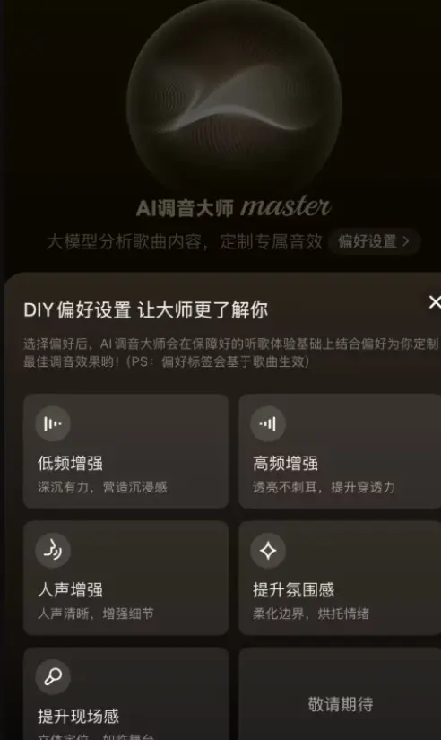 此外,個性化定製也是這一功能的一大亮點。用户可以在偏好設置中進行進一步調節,比如選擇 “低頻增強” 或者 “提升現場感” 等選項。AI 調音大師將會在確保整體聽歌體驗的基礎上,疊加用户的個性化偏好,讓每一首歌都能夠更加貼合用户的需求。