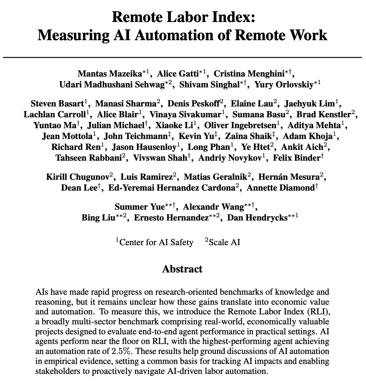 此研究由 Scale AI 與 Center for AI Safety(CAIS)聯合發起,該團隊構建了一個名為 “Remote Labor Index”(遠程勞動指數,RLI) 的基準,用以衡量 AI Agent 在真實、可付費的遠程/自由職業任務上的能力。樣本任務包括:從自由職業平台(如 Upwork)獲取真實任務,涵蓋數據抓取、圖形設計、視頻編輯、遊戲開發、行政協作等多種類型。