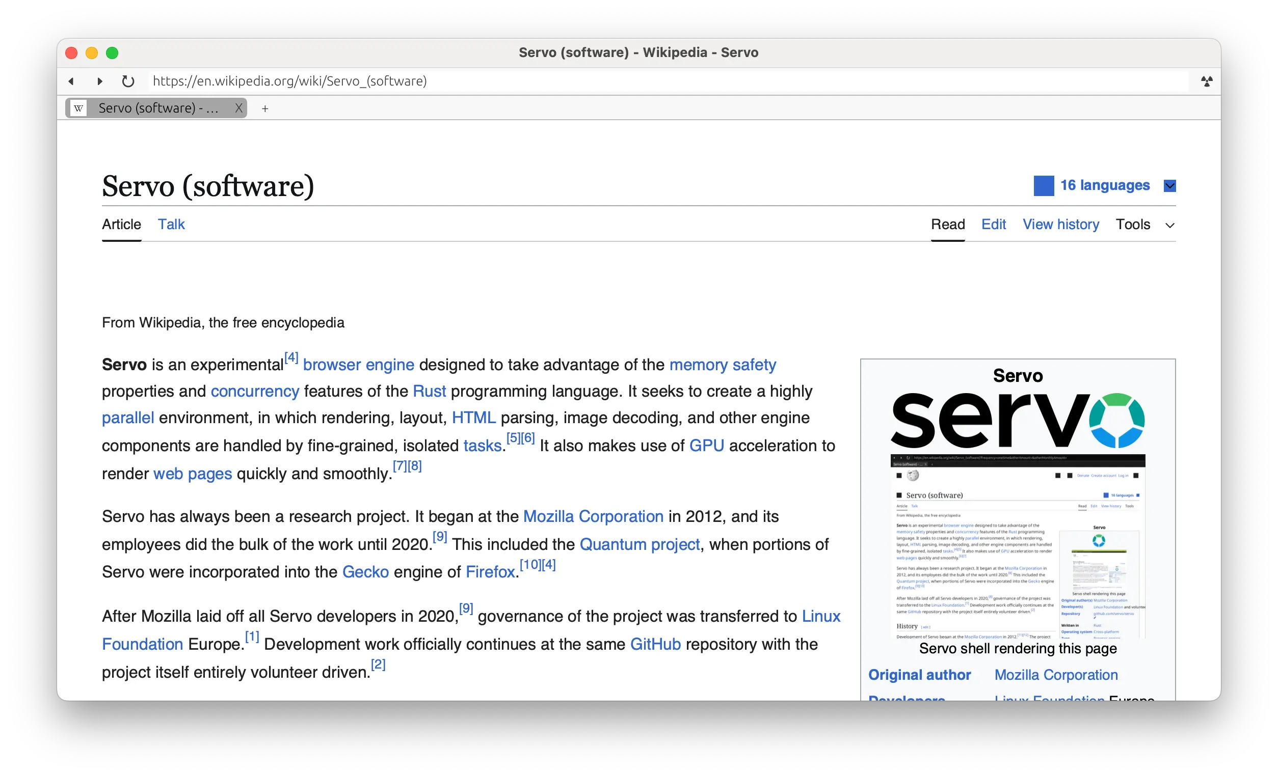 開源項目 Servo(一個用 Rust 編寫的網頁佈局/渲染引擎)發佈了 0.0.1 版本,Servo 最初由 Mozilla 基金會發起,後來交由 Linux 基金會接管。