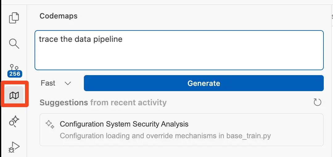 在 Windsurf 中打開代碼庫,觸發 Codemaps(點擊地圖圖標或快捷鍵 Cmd+Shift+C)